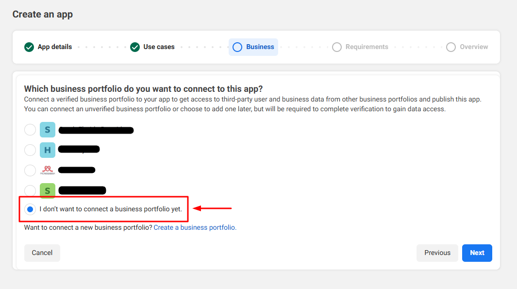 - Check the option 'I don't want to connect a business portfolio yet'.