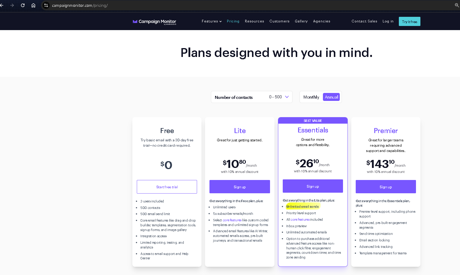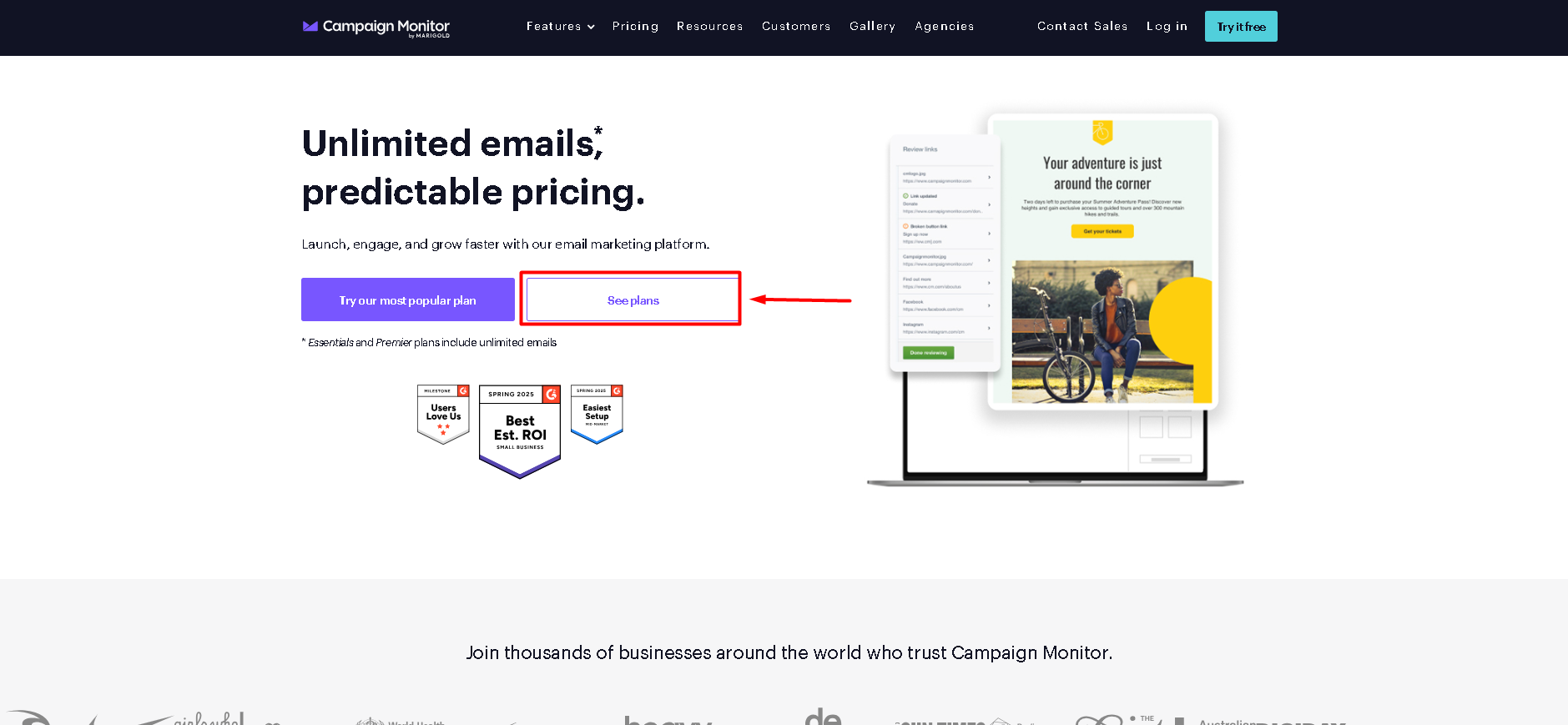 - Go to the Campaign Monitor website at https://www.campaignmonitor.com/ and click See Plans.