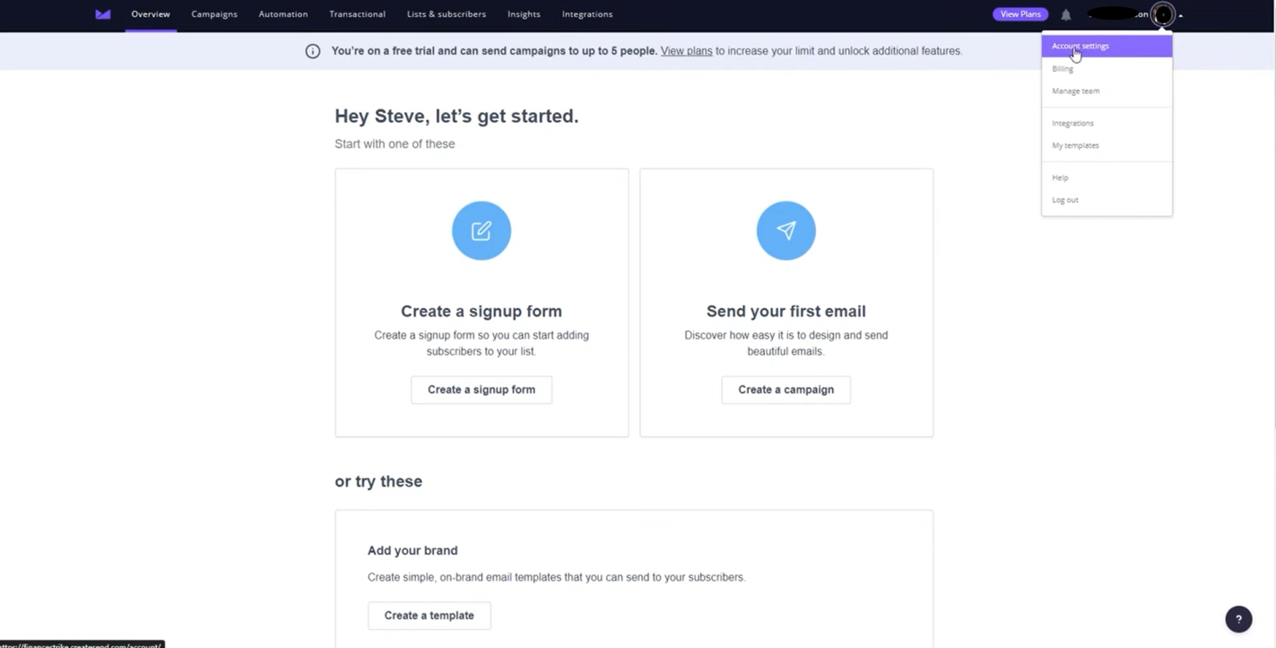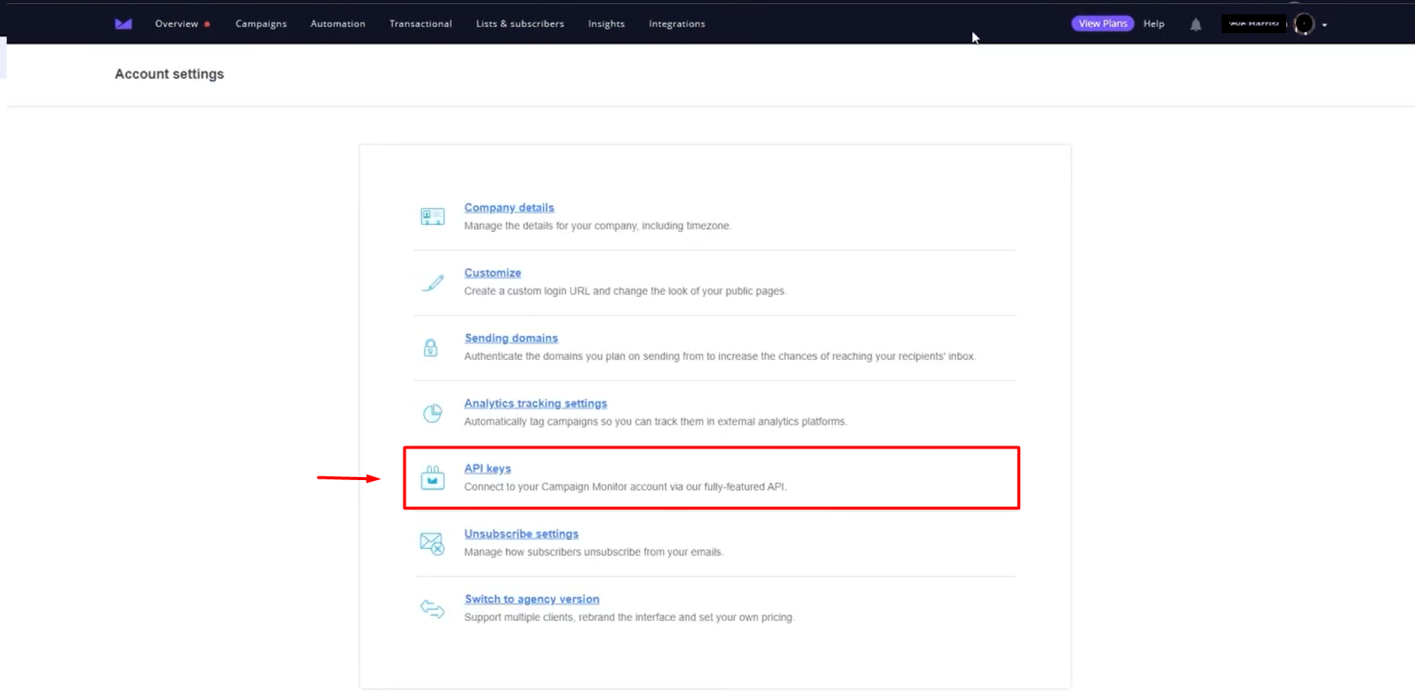 - Access your Campaign Monitor dashboard, click your profile, and select Account Settings.