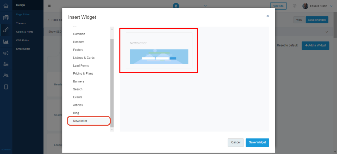 - Find and select the Newsletter widget.