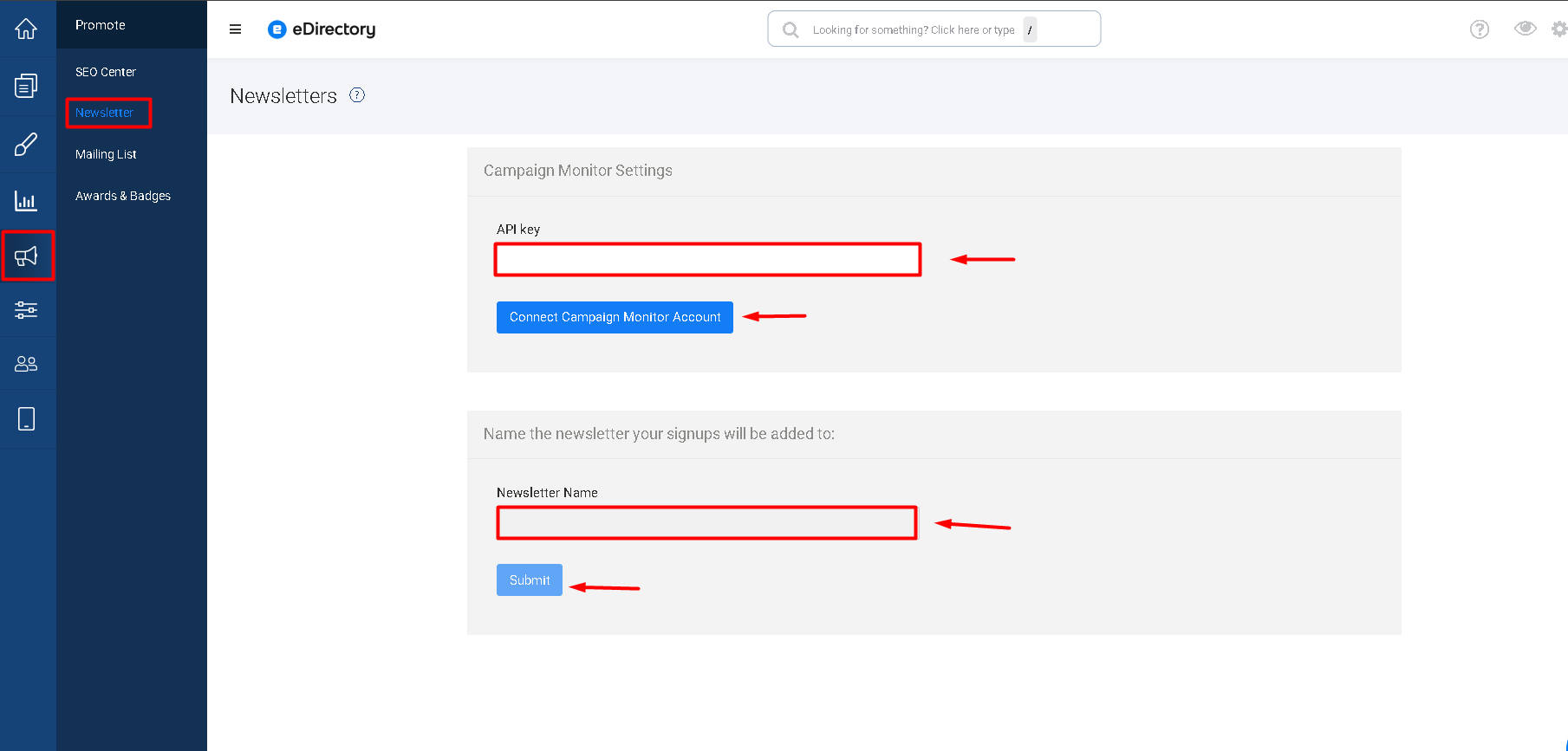 - In eDirectory, go to Promote > Newsletter in the Site Manager and paste your API key in the API Key field.