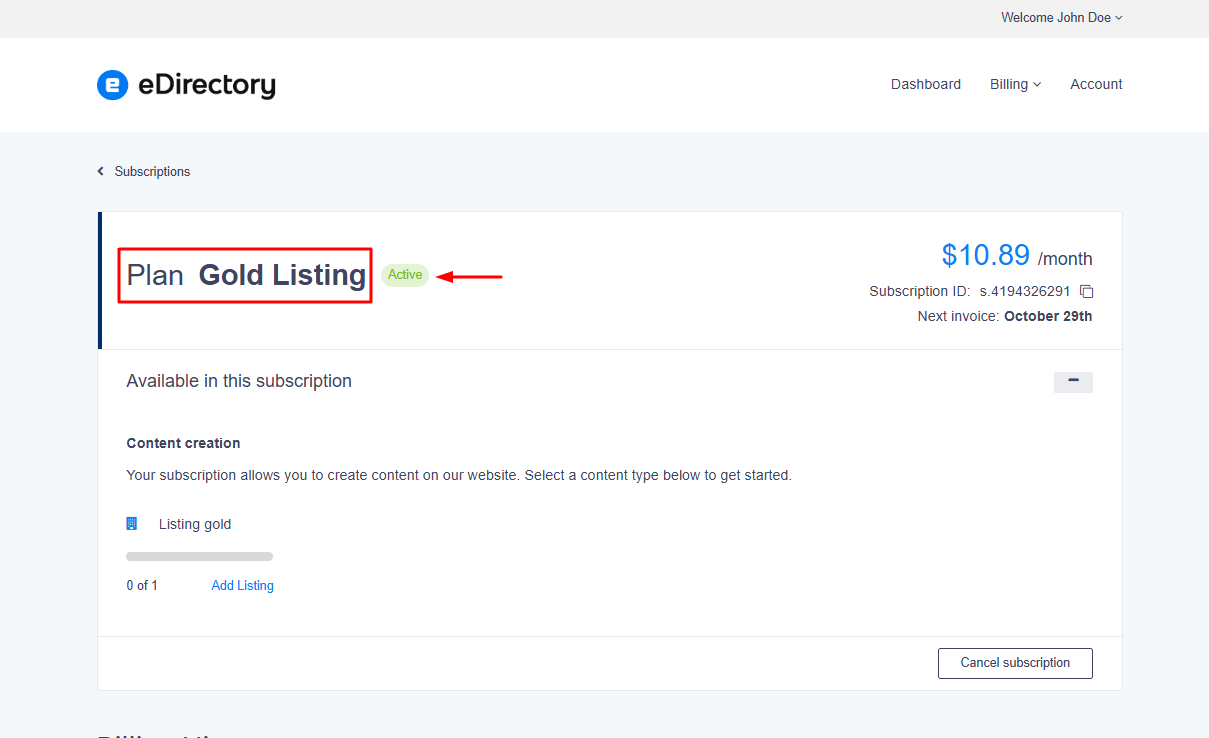 - There, the status of the new subscription will be displayed, indicating that it is active.