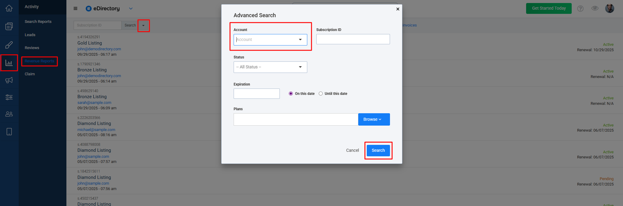 - Access Activities > Revenue Reports;