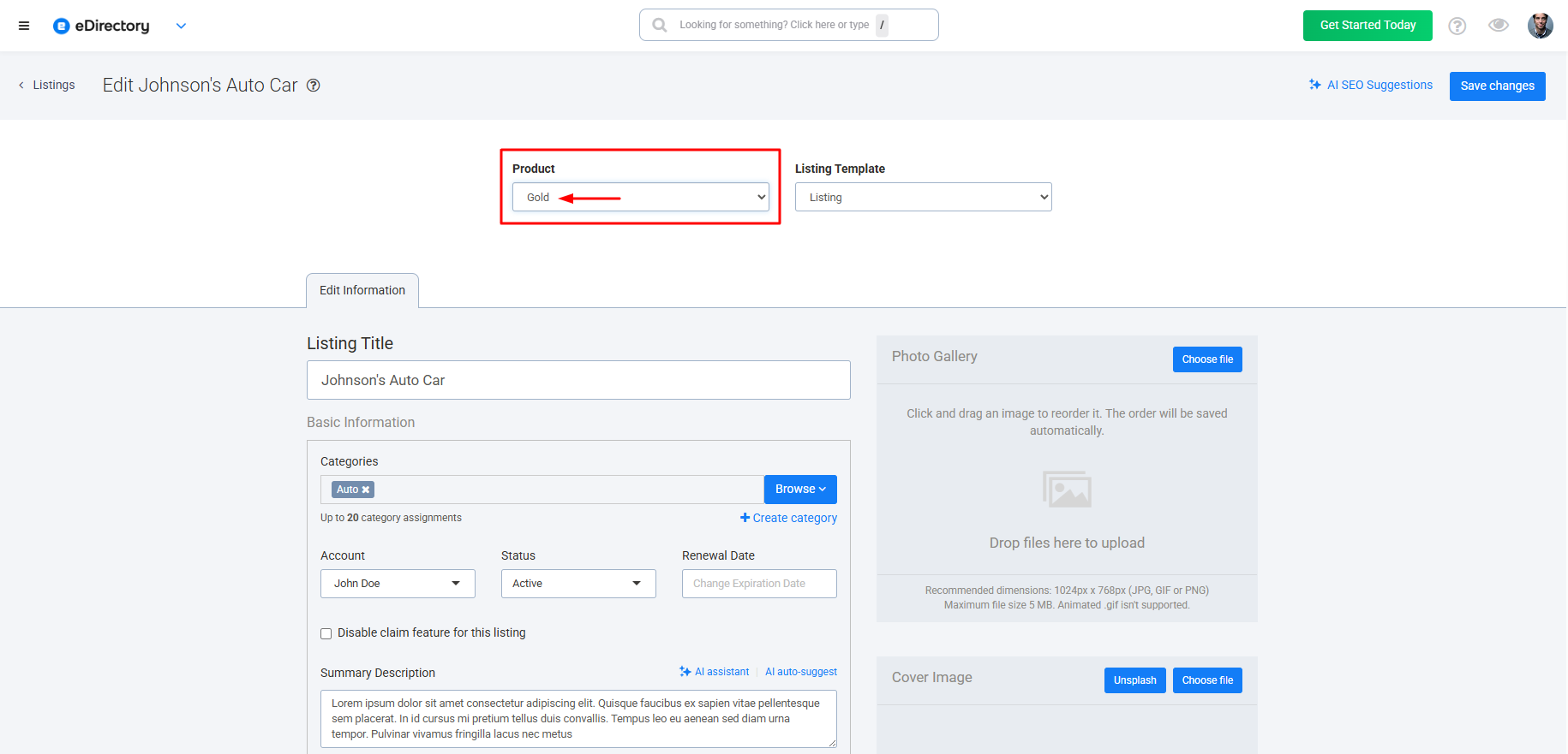 - Now, in the administrative panel of the listing form, change the product to the same type of product that the new Plan offers, in this case, Gold Listing.