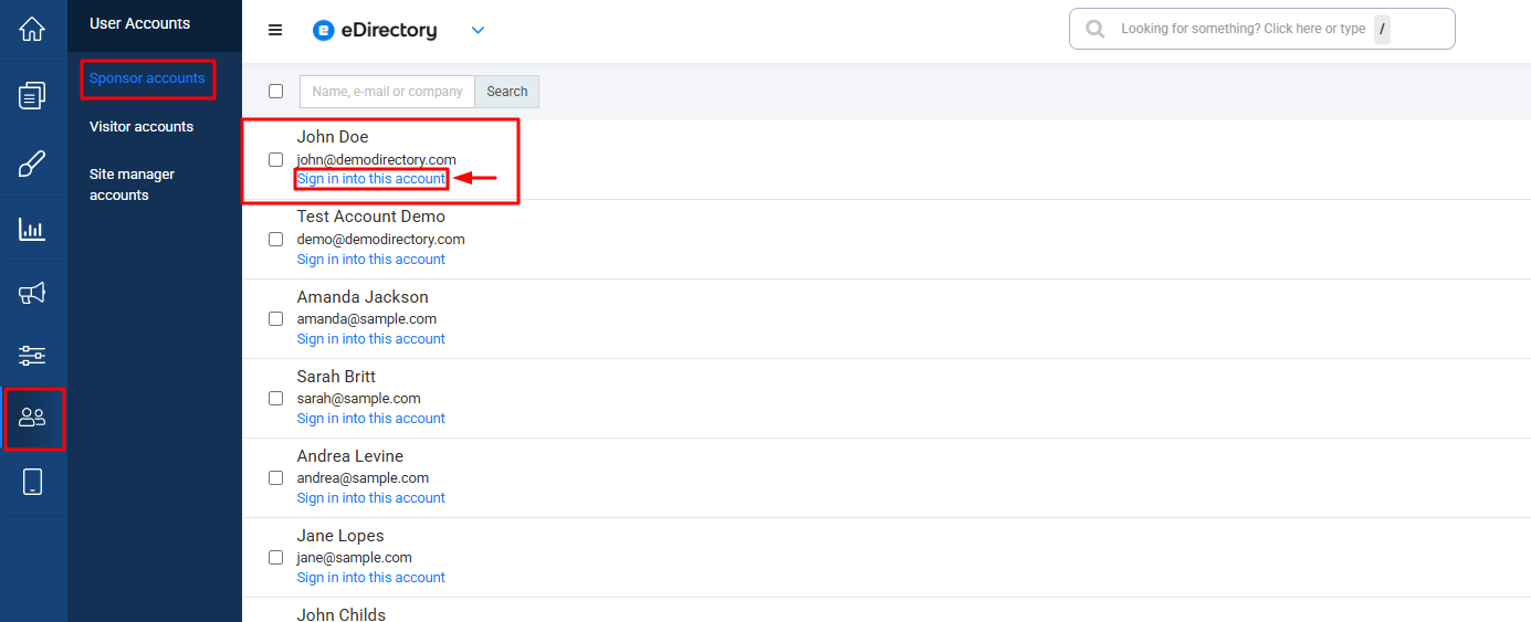 - The administrator must then access: User Accounts > Sponsor Accounts, locate the customer in question, and click on 'Sign in into this account'.