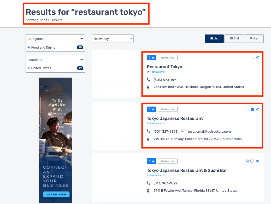 Example: A Gold listing named “Restaurant Tokyo” may appear above a Diamond listing named “Tokyo Japanese Restaurant” if the search term is “Restaurant Tokyo.”