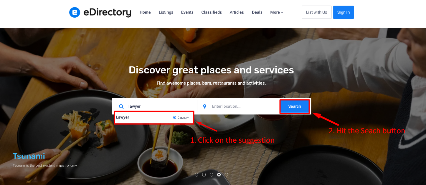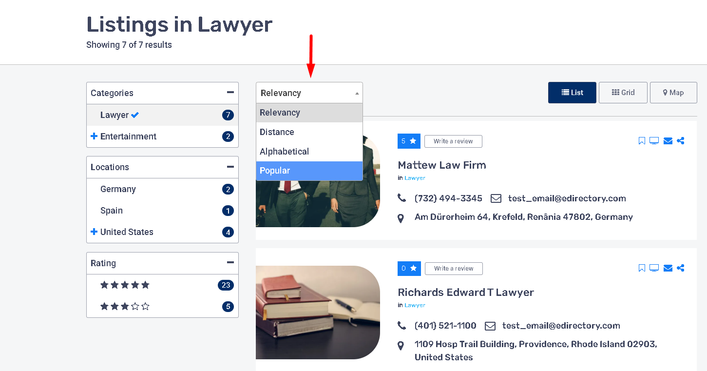 Example: Typing “Lawyer” and pressing Enter may show various listings containing the word “lawyer” anywhere in their content.