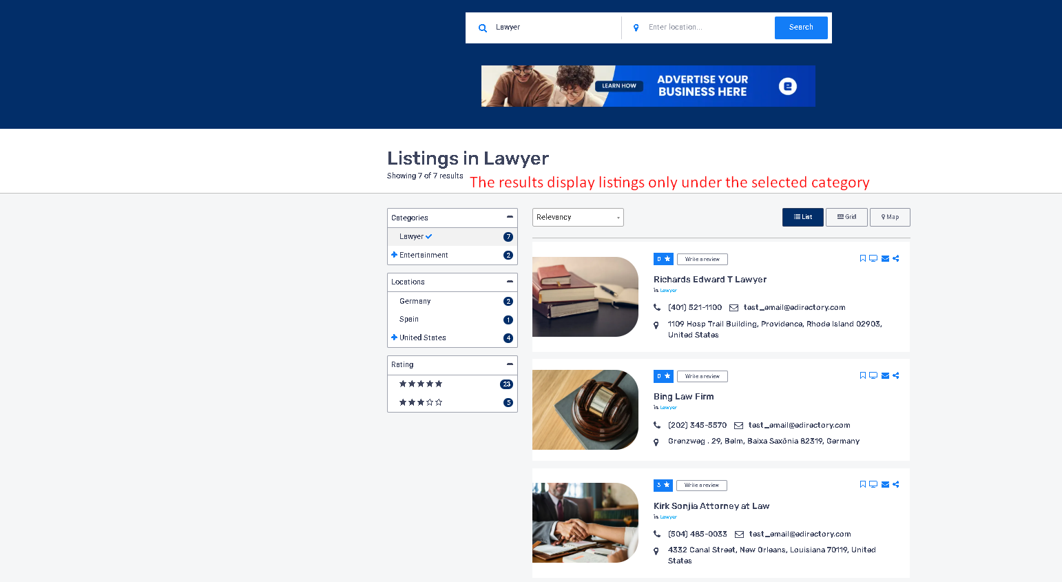 But selecting the Lawyer category from the dropdown will show only listings assigned to that category, even if others mention “lawyer” in their description.