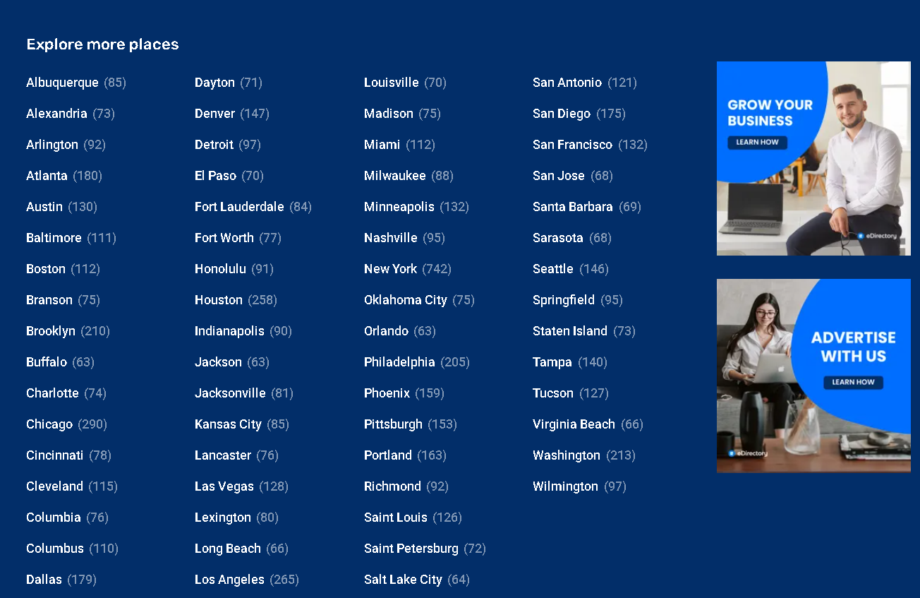 When a visitor uses the search bar in eDirectory—either the keyword field or the location field—the platform uses Elasticsearch to determine the most relevant results. There are two different search experiences, each producing different types of results.
