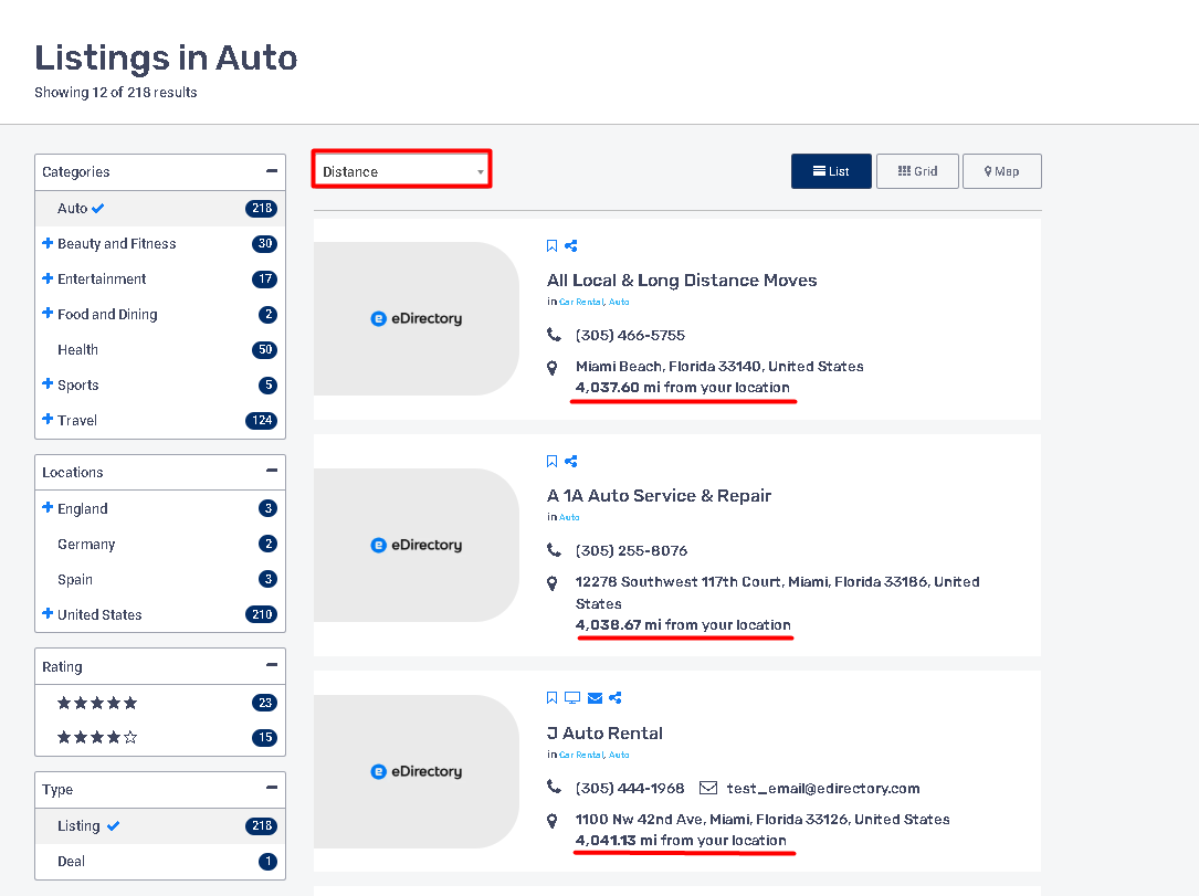 Important: For the Distance feature to function properly, a Google API key must be installed on your site. You can learn how to set this up by following the steps in this article: How to Activate Google Nearby Results API. Additionally, you can learn more about how this functionality works in this article: Understanding eDirectory's Nearby Results Feature