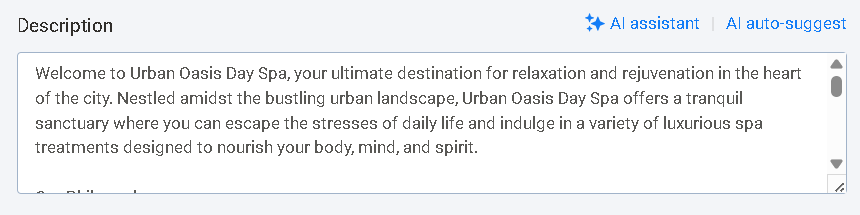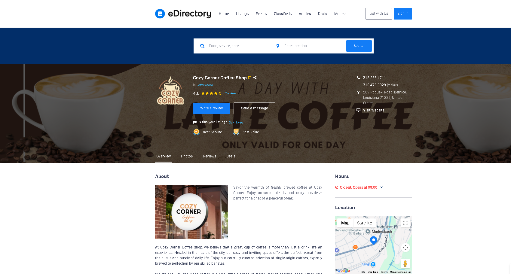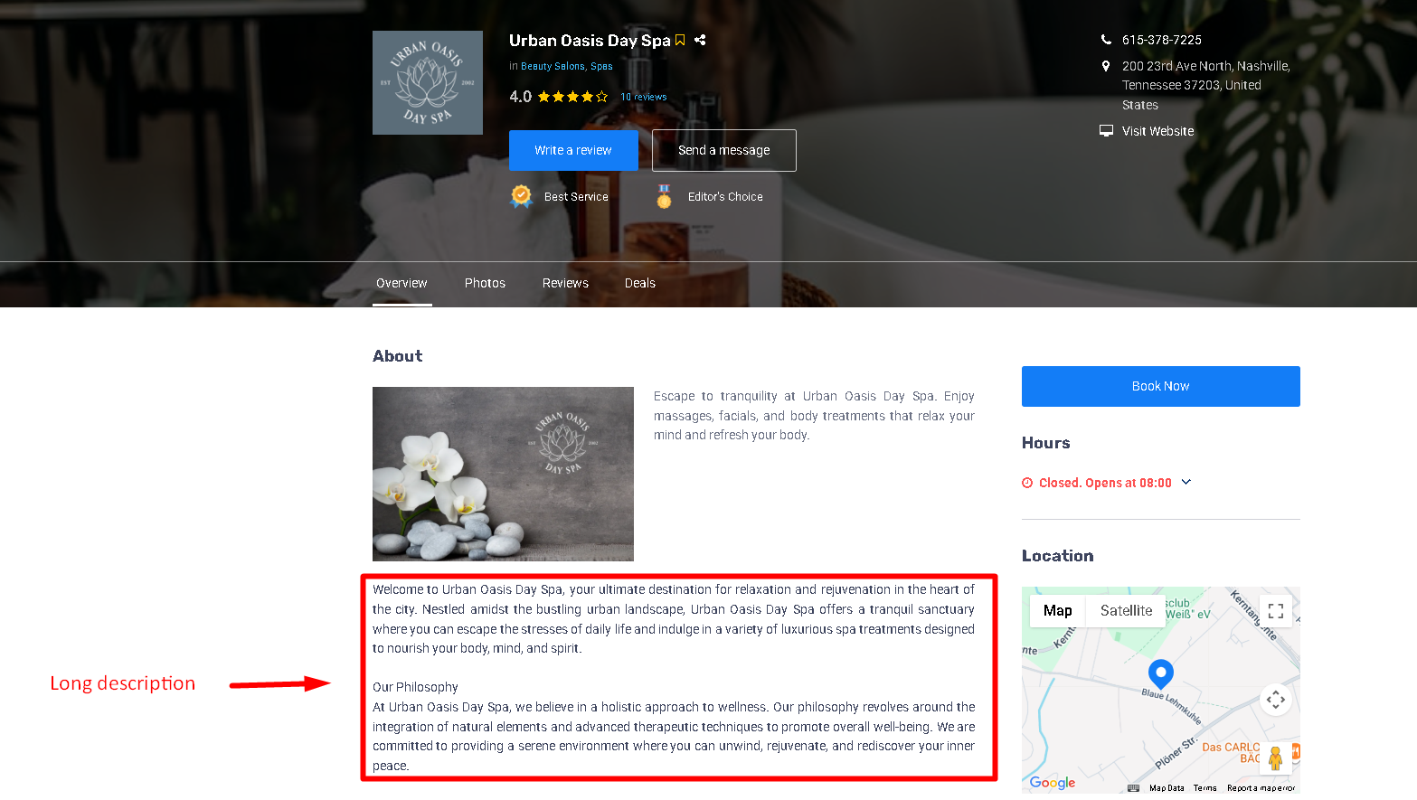 The full, detailed description displayed on the listing’s detail page. Ideal for complete business information or storytelling.