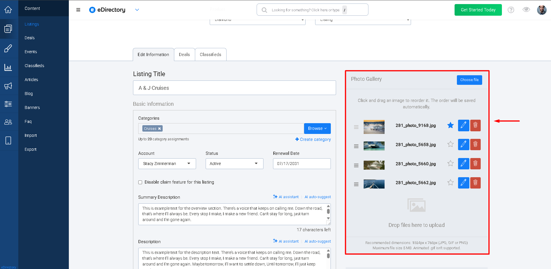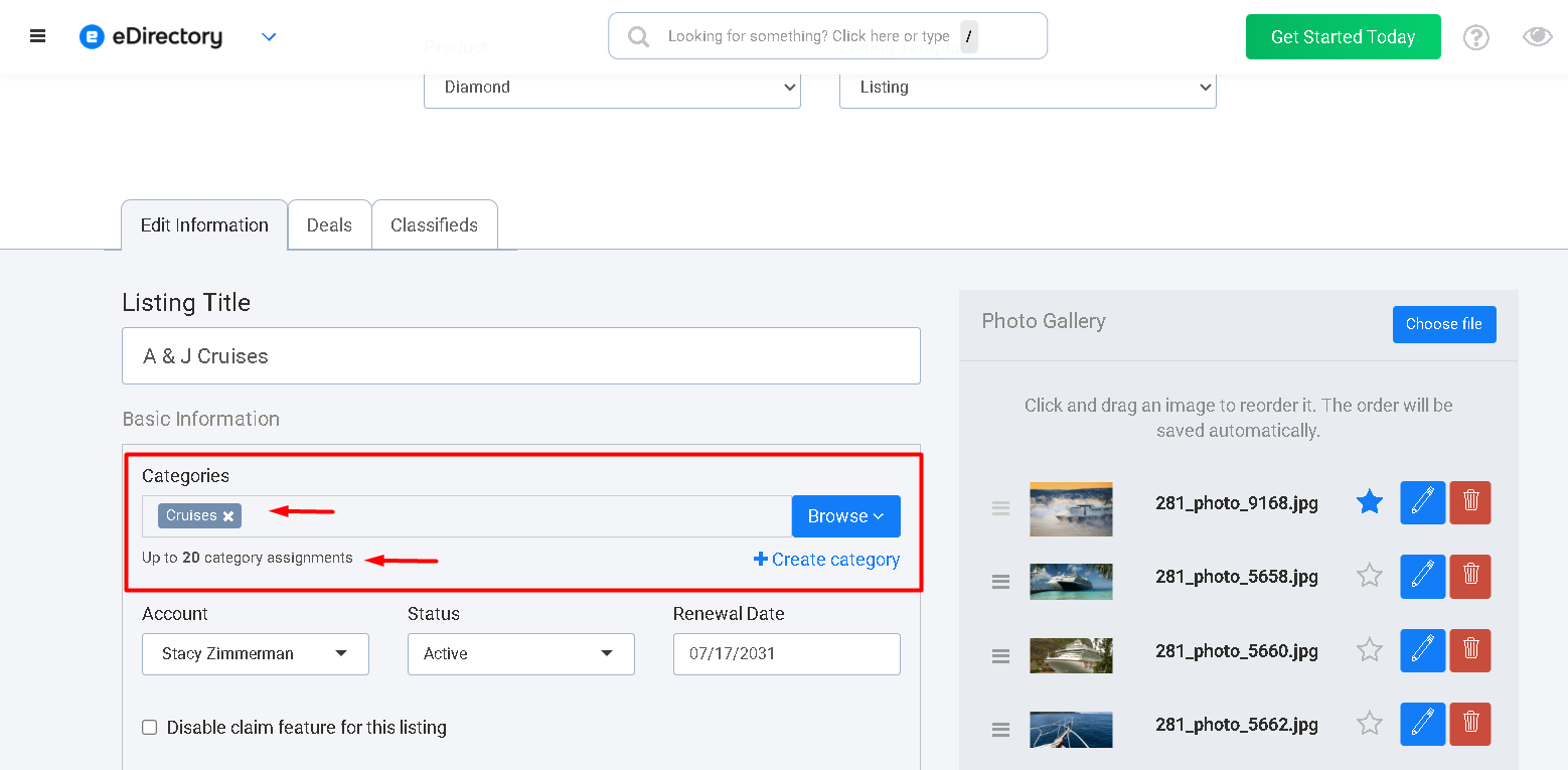 Controls how many photo gallery images the listing owner can upload in the Photo Gallery section of their listing form. More images typically enhance visibility and professionalism.