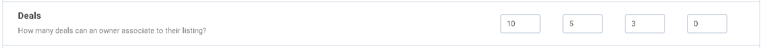 This feature determines how many deals a listing owner is allowed to add to the site. The number you set here represents the maximum number of deals that can be added and associated with one single listing within that listing level.