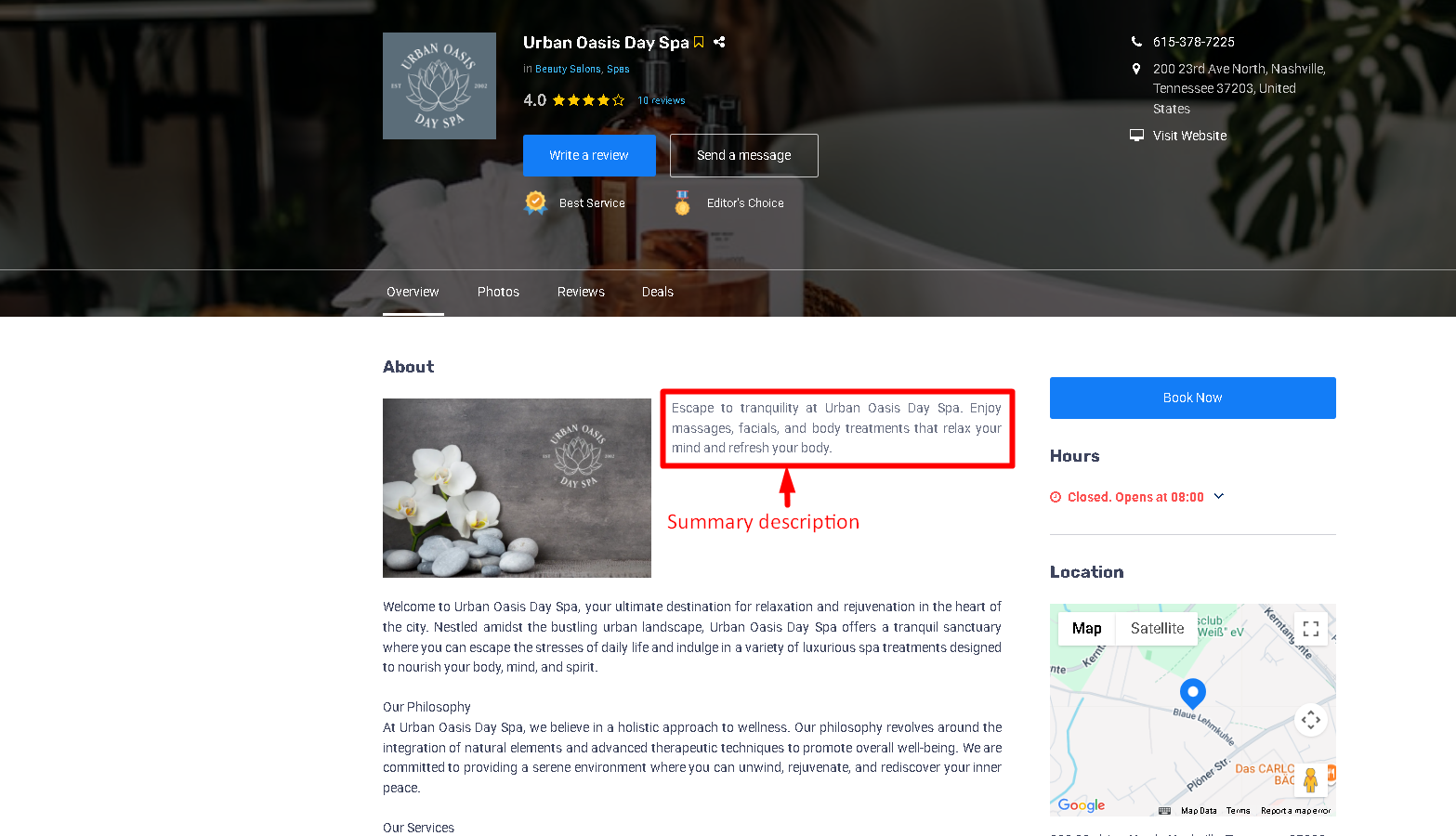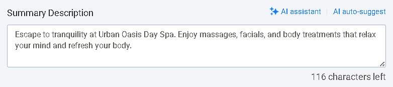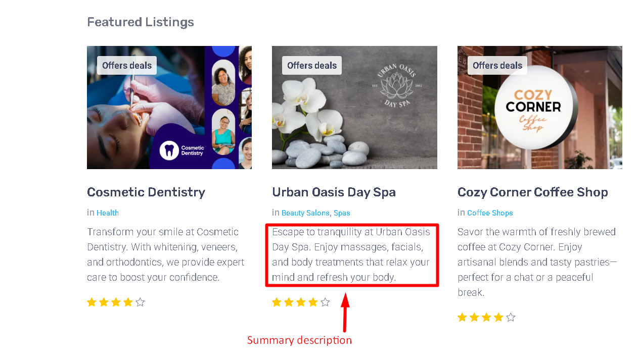 A short summary shown in listing thumbnails and in the listing detail page. This field helps listings stand out in condensed views.