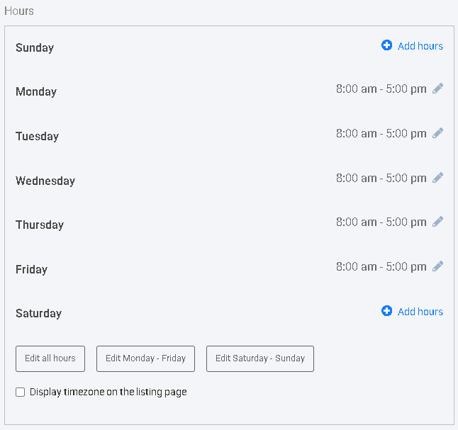 Allows listing owners to enter business operating hours, which appear neatly in the listing.