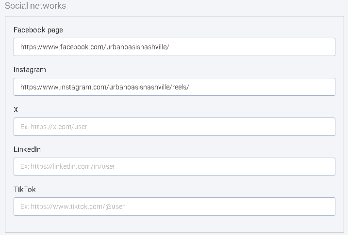 Lets listing owners add social media links (Instagram, LinkedIn, X, Facebook, and Tik Tok).