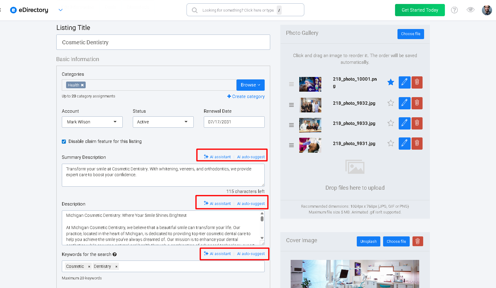 Important: for the AI Auto Suggest feature to function, your site must be connected to the ChatGPT API. Without this integration, AI-powered suggestions will not appear in the listing form. You can find step-by-step instructions on how to set up this integration here: How to Integrate ChatGPT with eDirectory