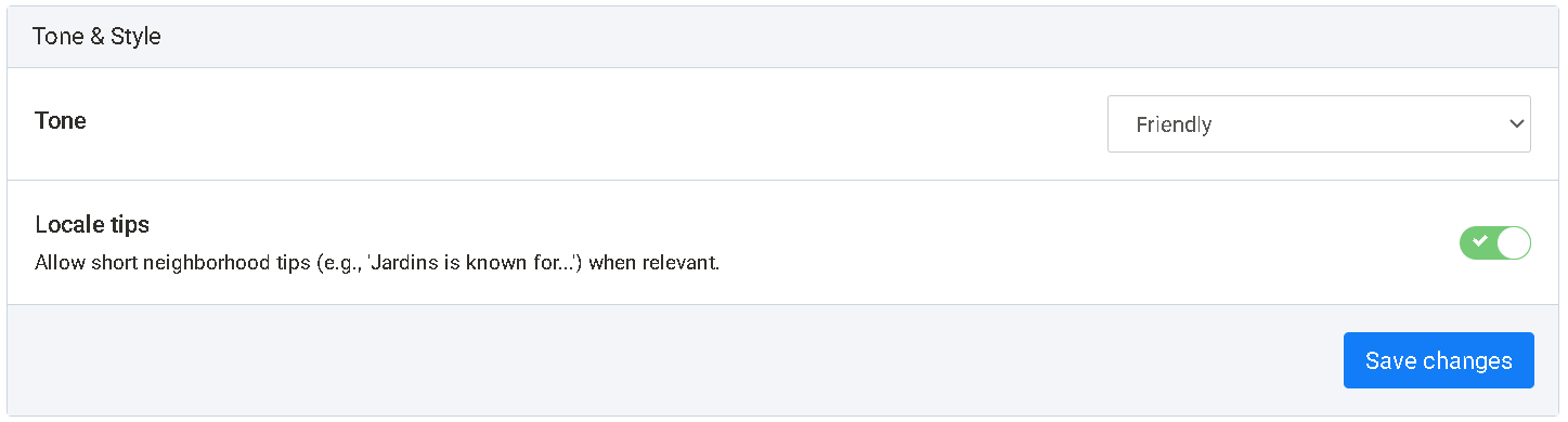 - Tone & Style – how the AI speaks and whether it adds local tips
