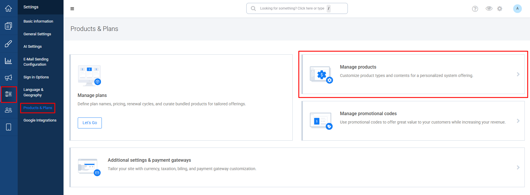 - Navigate to Settings → Products & Plans