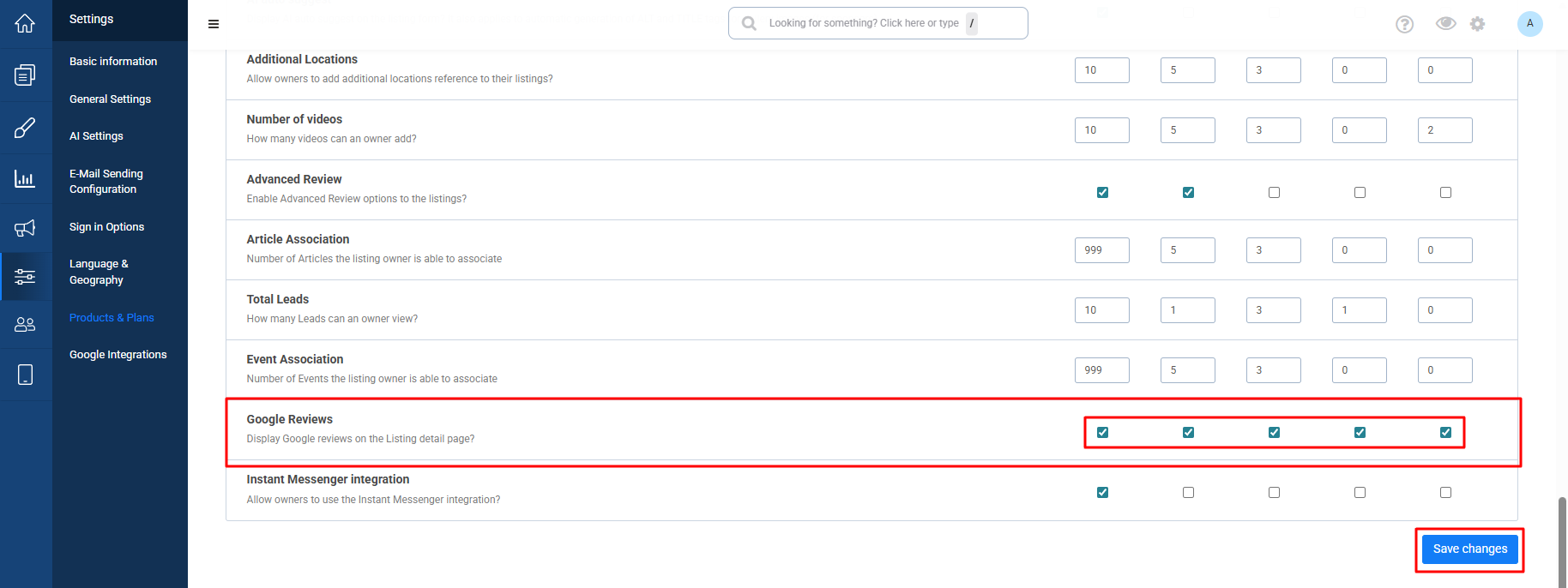 Google Reviews availability is defined at the product (pricing plan) level. This means each plan can independently have the feature enabled or disabled.