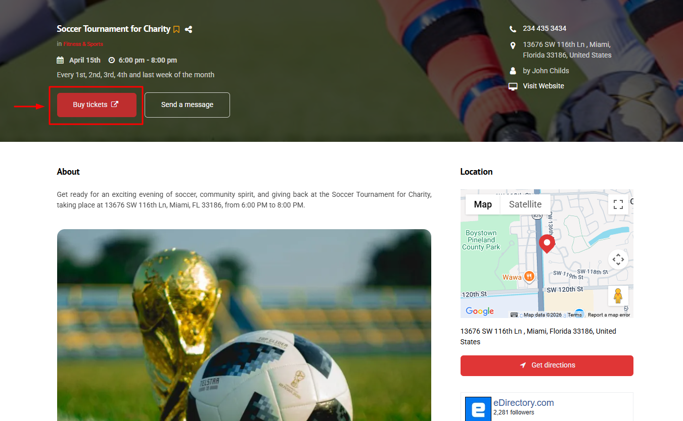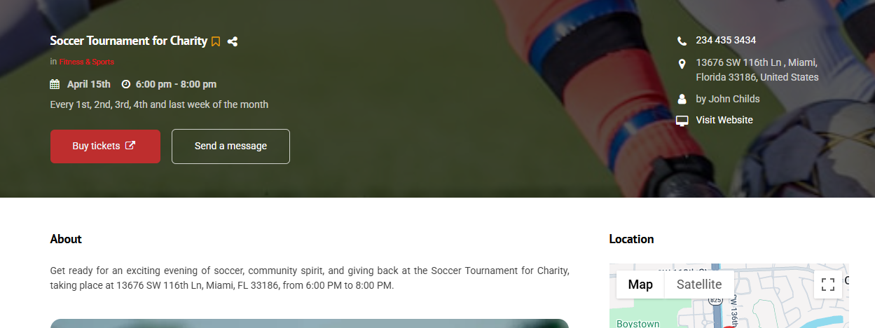 The Tickets URL field lets you associate an external link with an event. Once a valid URL is added, a “Buy Tickets” button will automatically appear on the event detail page.