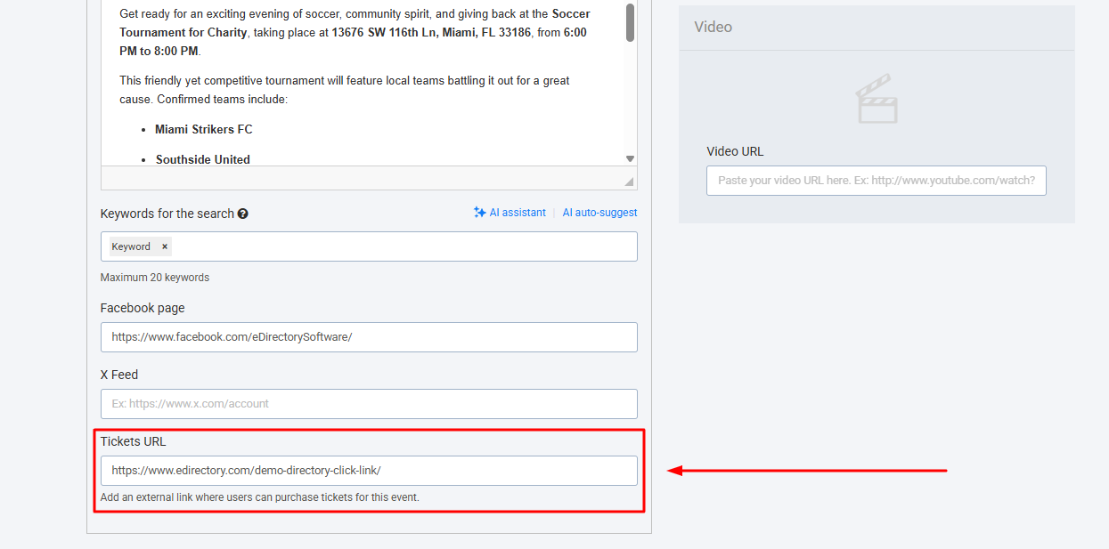 Adding a Tickets URL to your events provides a direct path for users to complete actions such as purchasing tickets or registering. This helps improve user experience while allowing you to integrate seamlessly with external platforms or ticketing services.