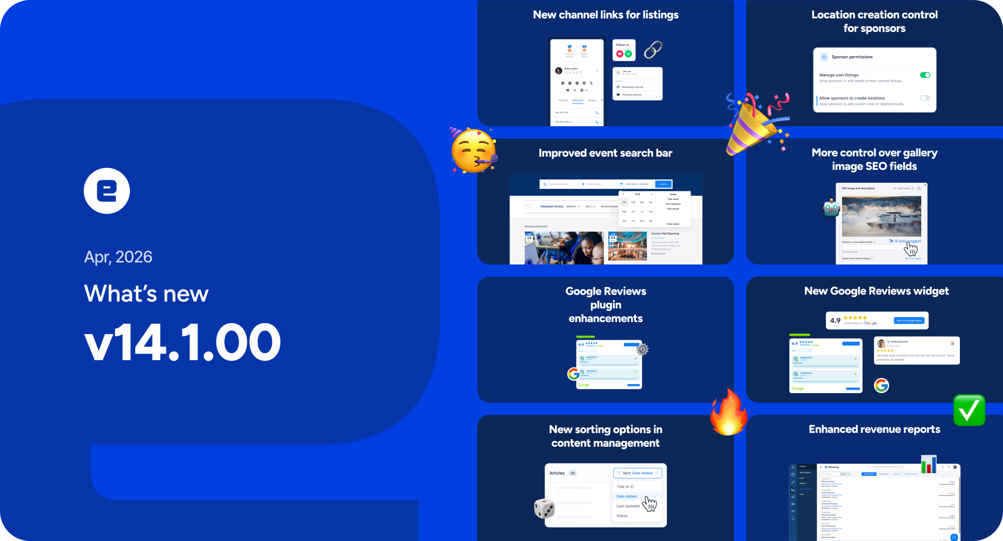 eDirectory v14.1 focuses on giving site managers more control over monetization, improving search relevance through AI enhancements, and expanding event capabilities. With added flexibility in feature distribution, better reporting tools, and important system fixes, this release helps create a more efficient and reliable platform.