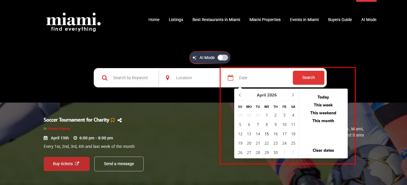 - Improved Event Search: Users can now filter events using custom date ranges from a calendar or quick options like This Week and This Weekend.